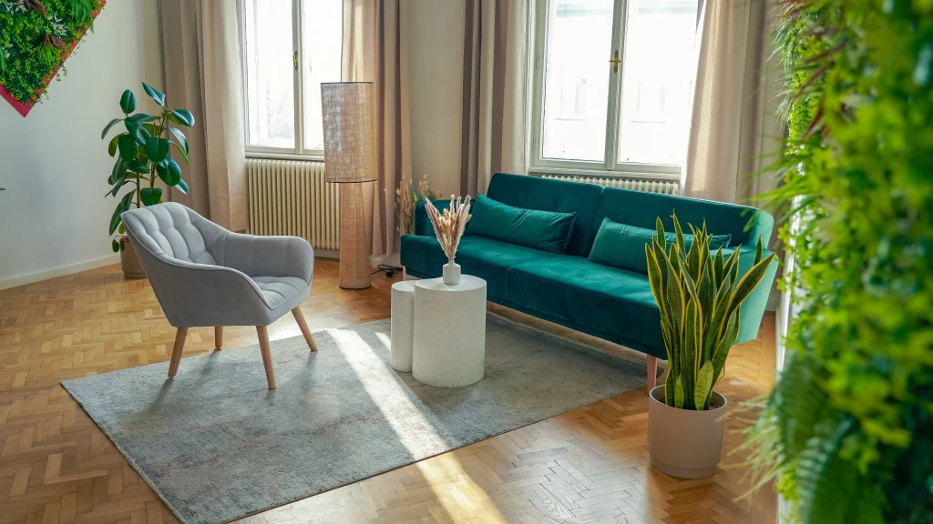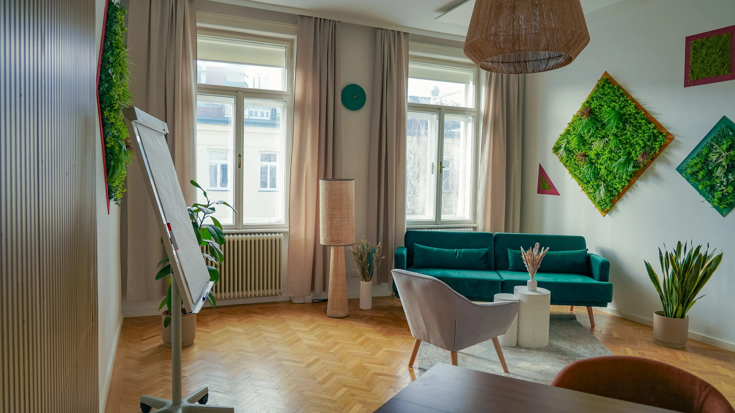 Satiria ist ein großzügiger Raum, der sich besonders gut als Gruppenraum nutzen lässt. Ausgestattet mit einem Schreibtisch und einem Flipchart bietet er vielseitige Einsatzmöglichkeiten – von Workshops über Gruppentherapie bis hin zu Team- oder Seminarformaten. Mit 28 m² Raumfläche und Klimaanlage schafft Satiria eine offene, angenehme Umgebung, die sowohl konzentriertes Arbeiten als auch lebendigen Austausch optimal unterstützt.
